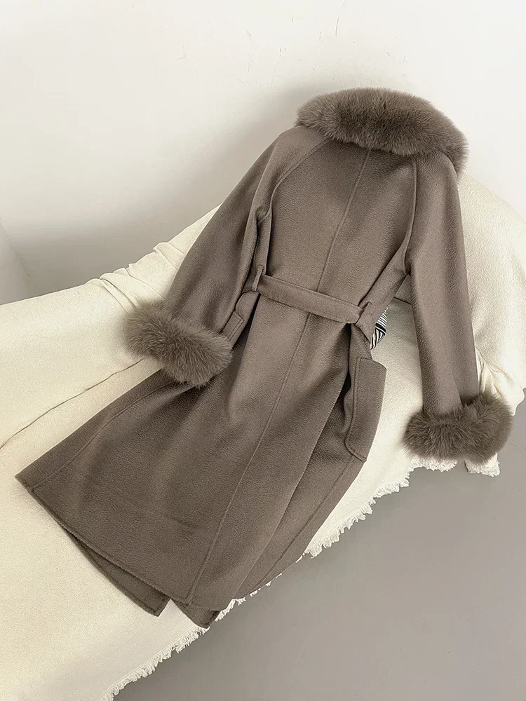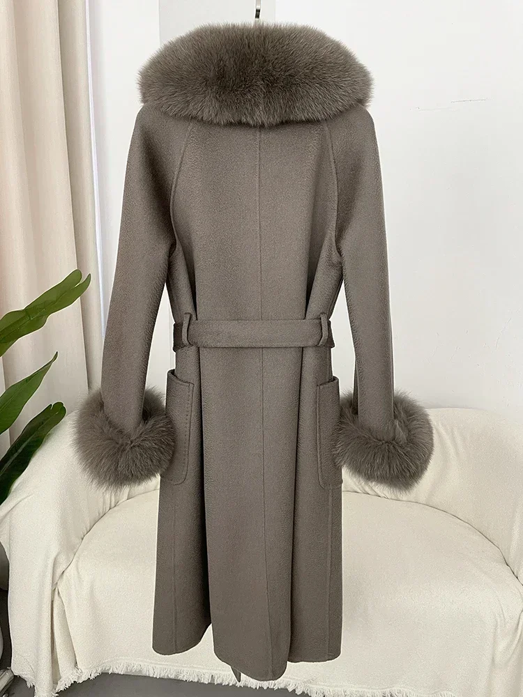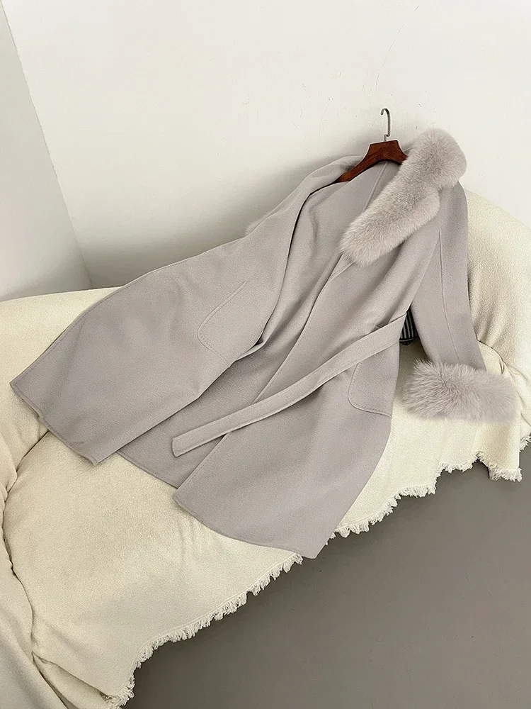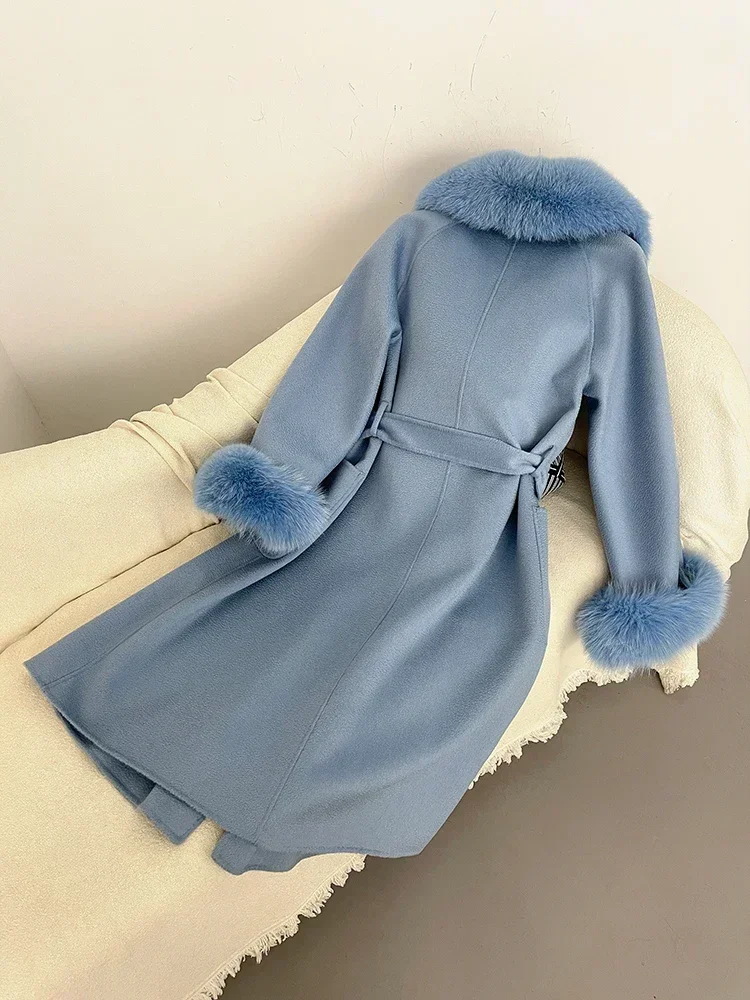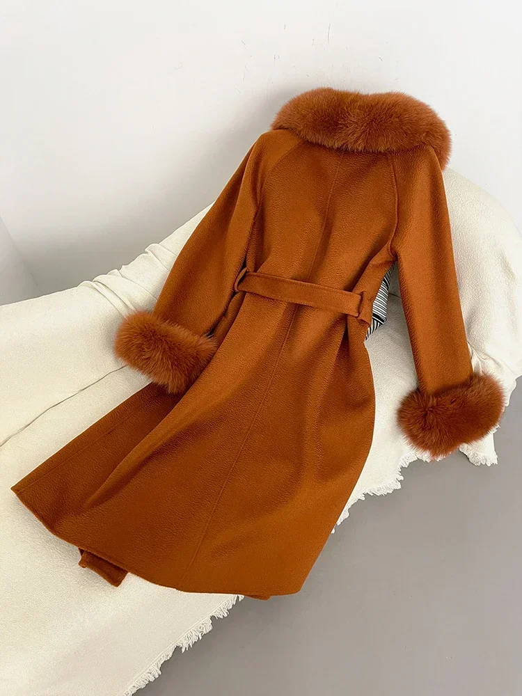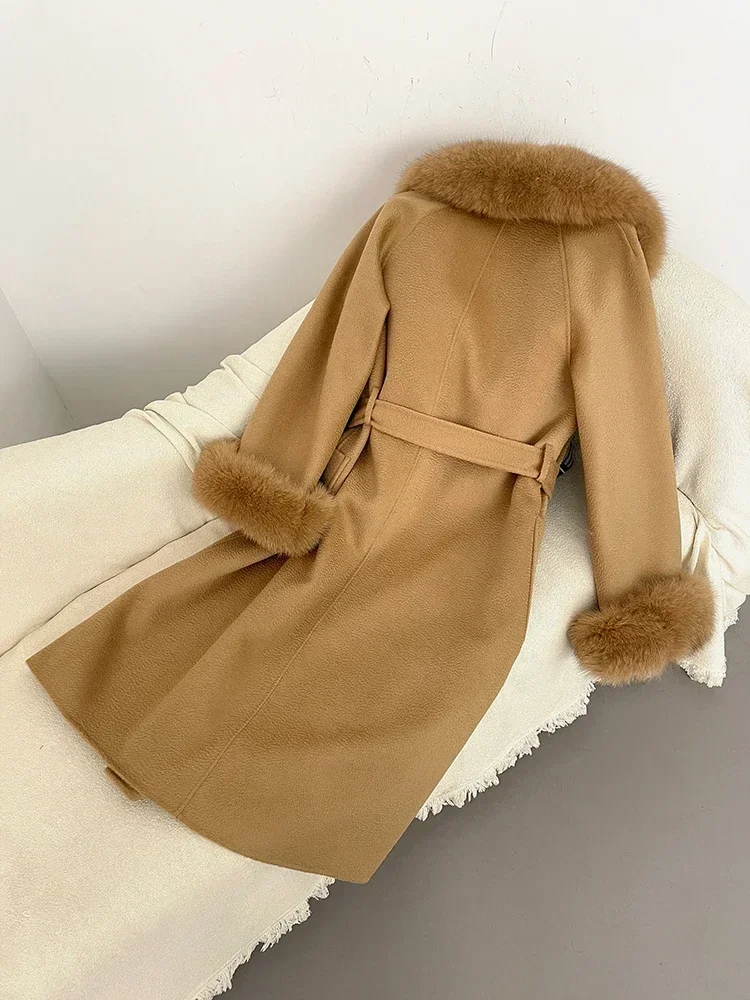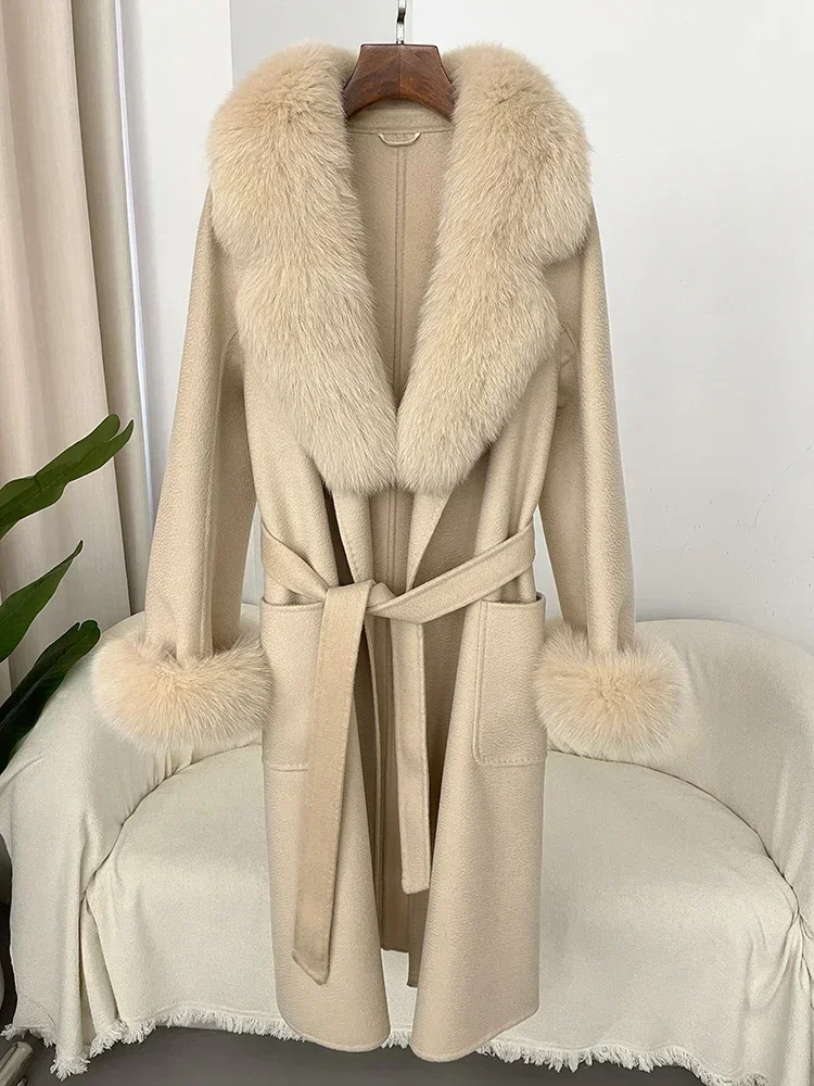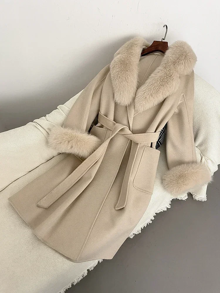 100% Wool Water-Corrugated Woolen Coat with Detachable Fox Fur Collar Women Daily Casual Wear 2024 Autumn Winter Original Design