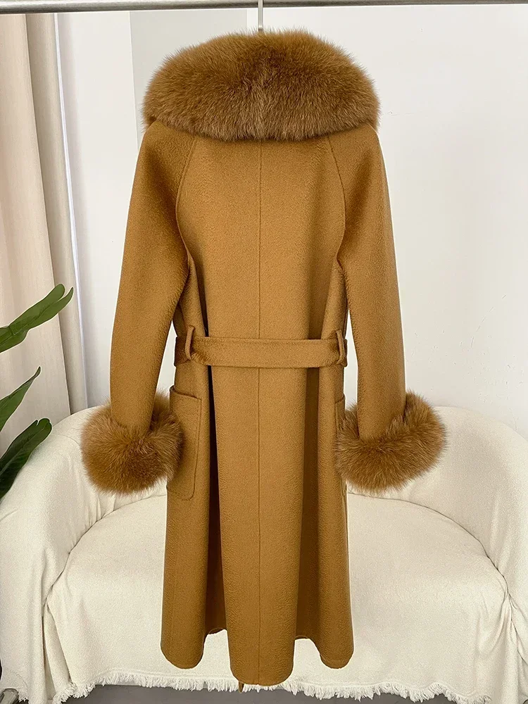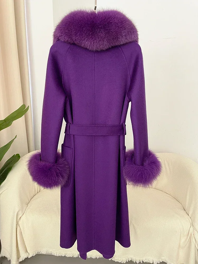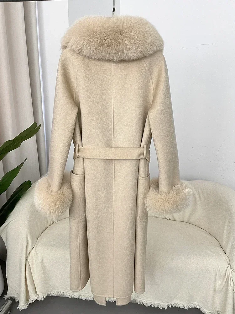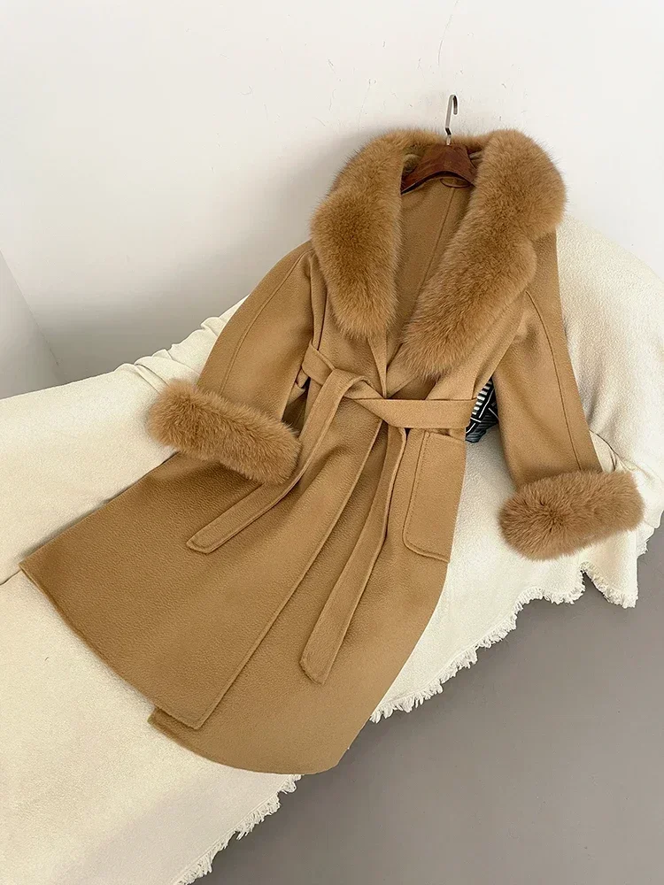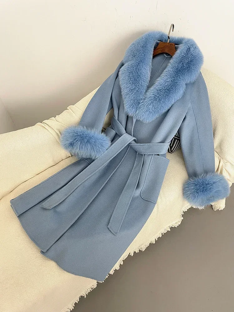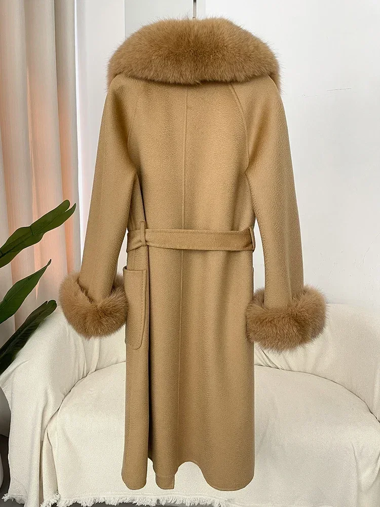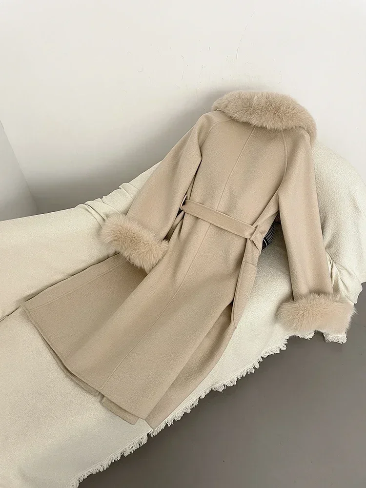 100% Wool Water-Corrugated Woolen Coat with Detachable Fox Fur Collar Women Daily Casual Wear 2024 Autumn Winter Original Design