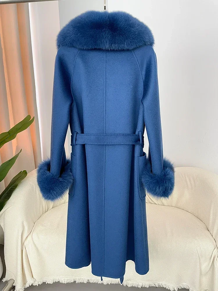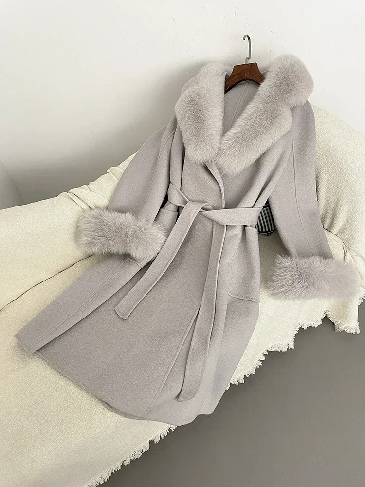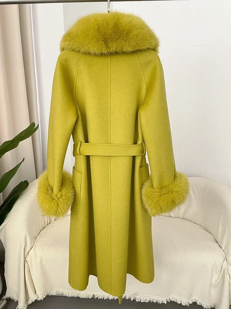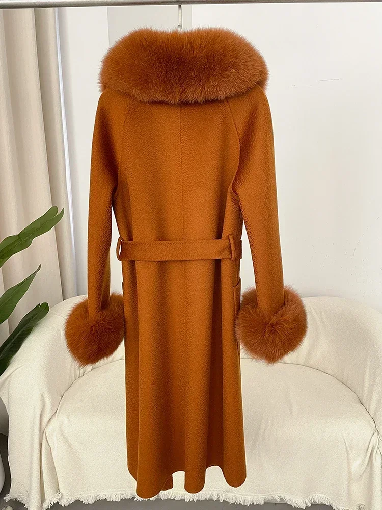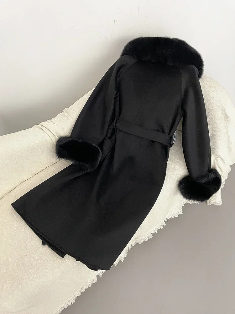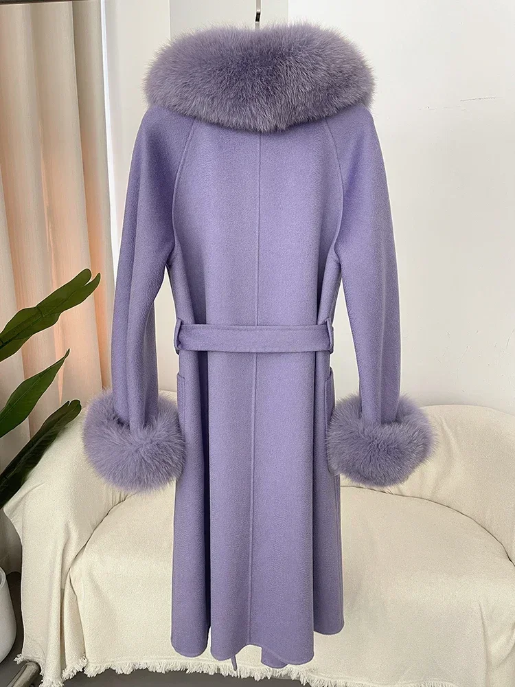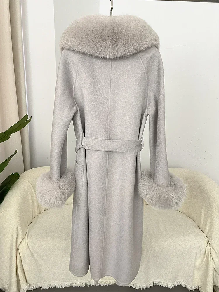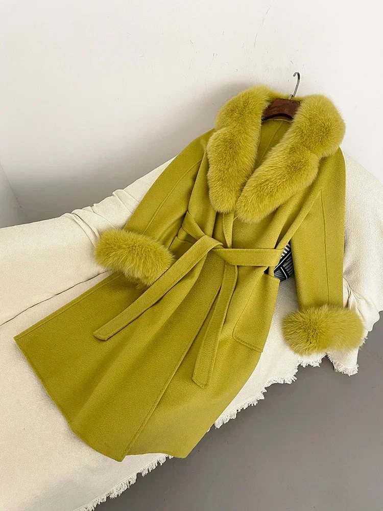 100% Wool Water-Corrugated Woolen Coat with Detachable Fox Fur Collar Women Daily Casual Wear 2024 Autumn Winter Original Design