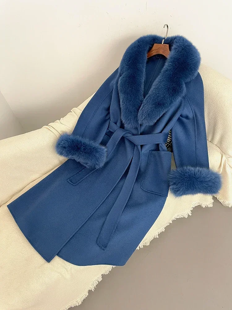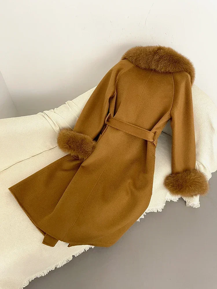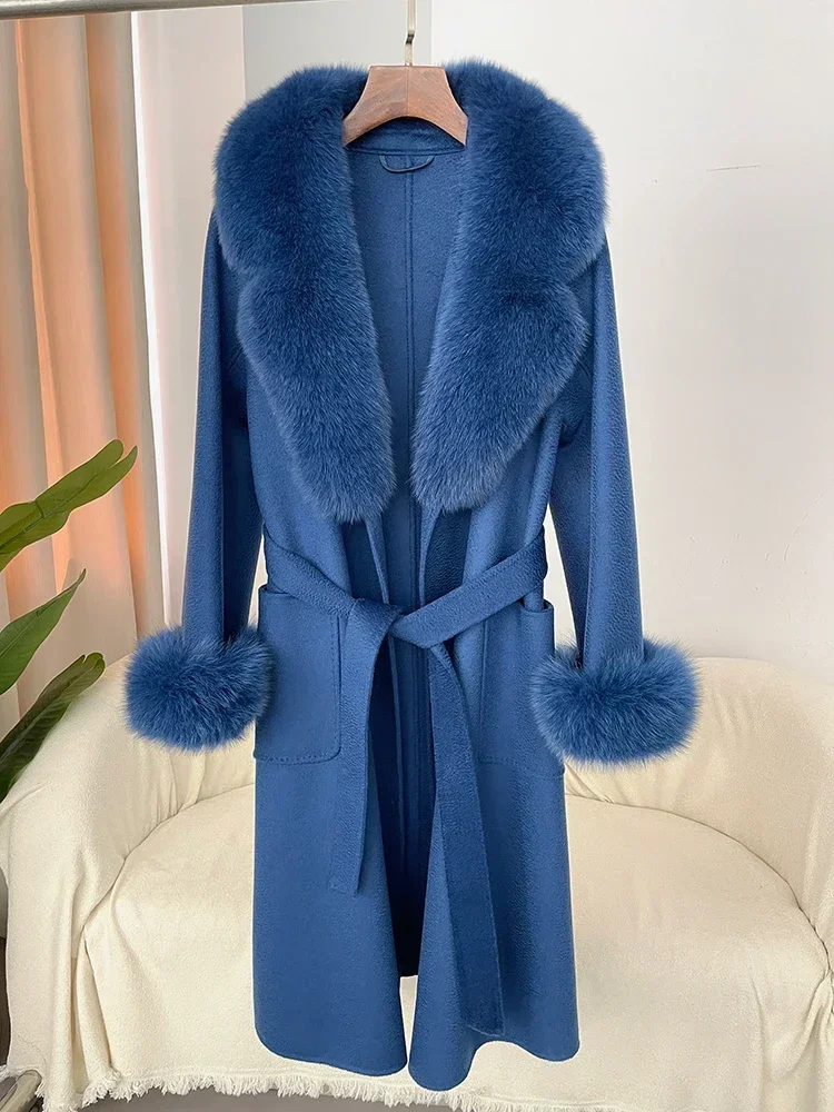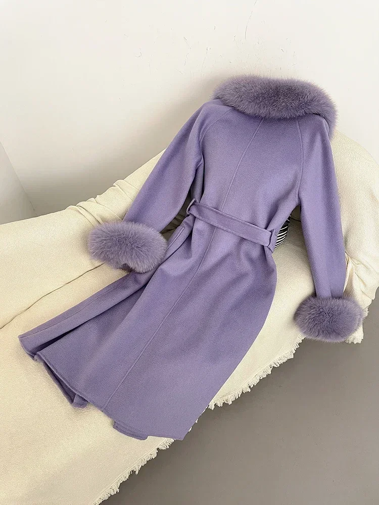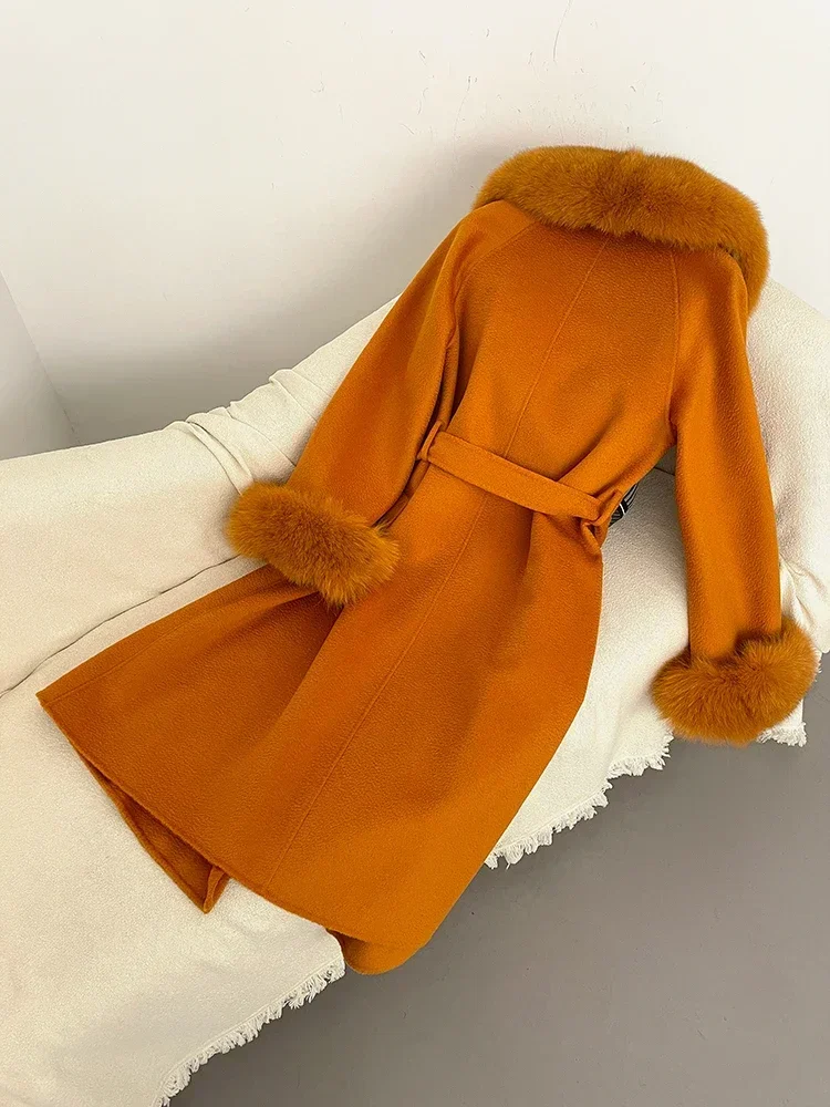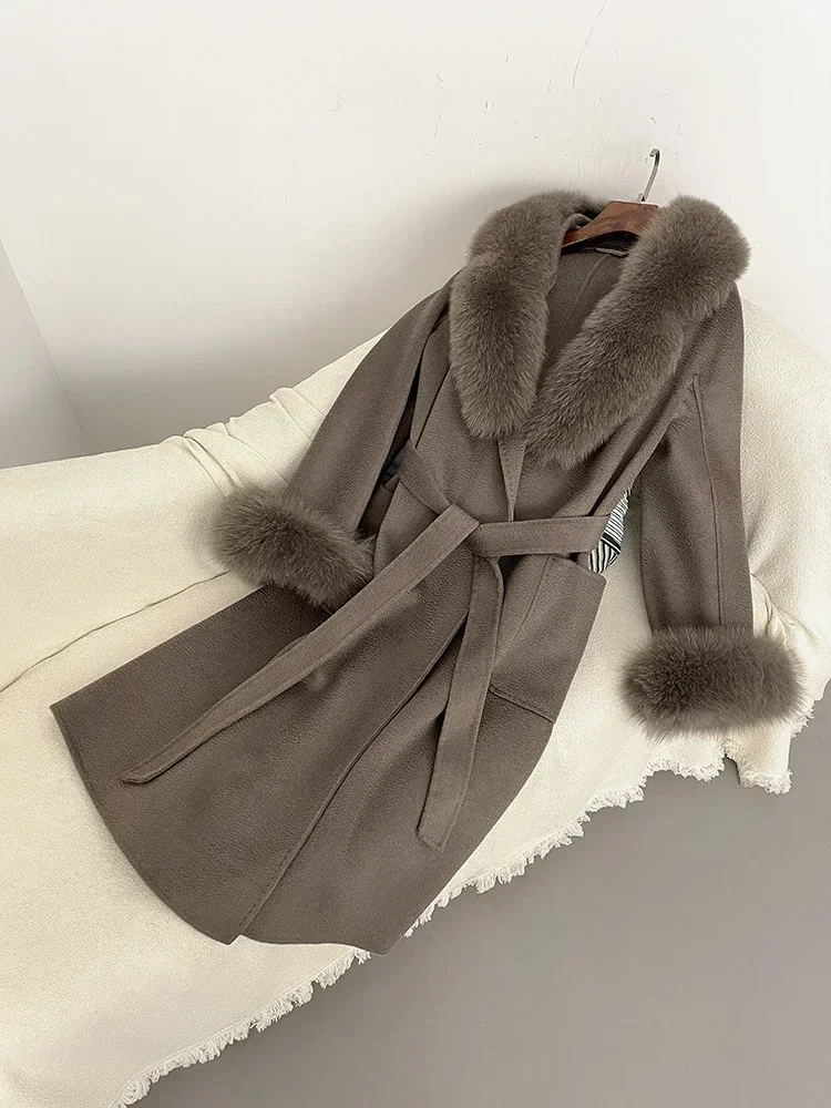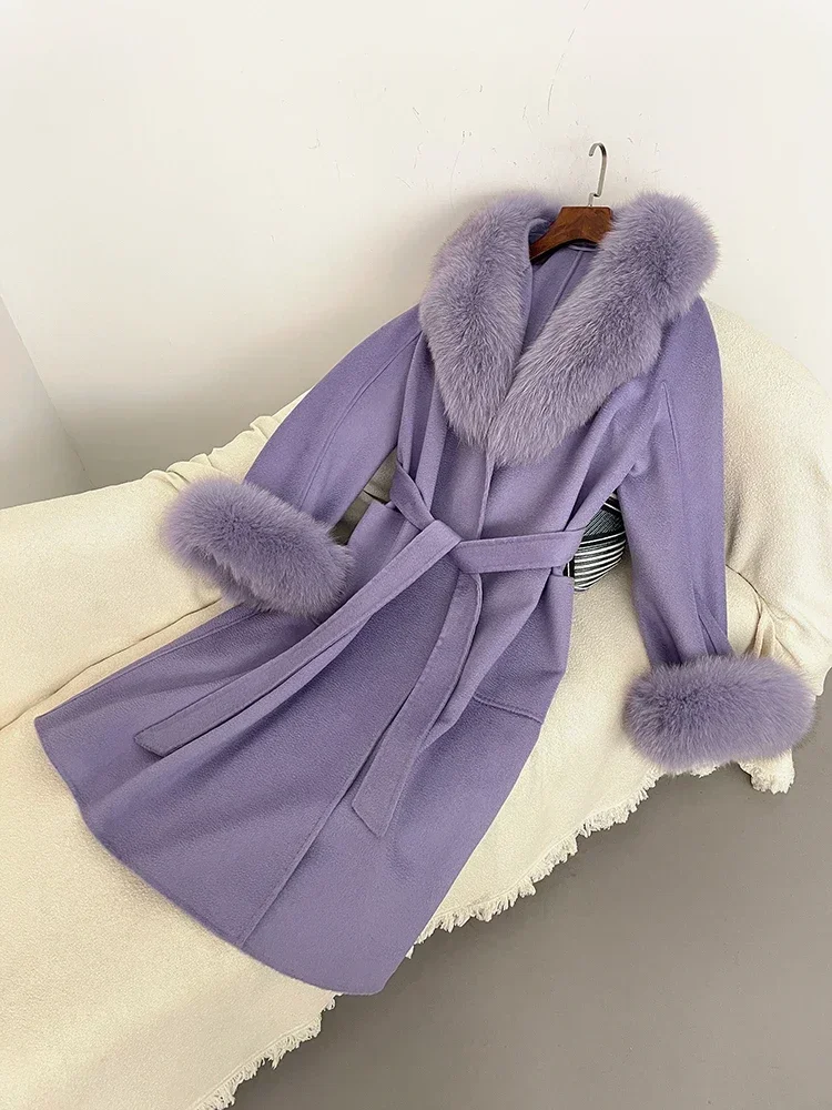 100% Wool Water-Corrugated Woolen Coat with Detachable Fox Fur Collar Women Daily Casual Wear 2024 Autumn Winter Original Design
