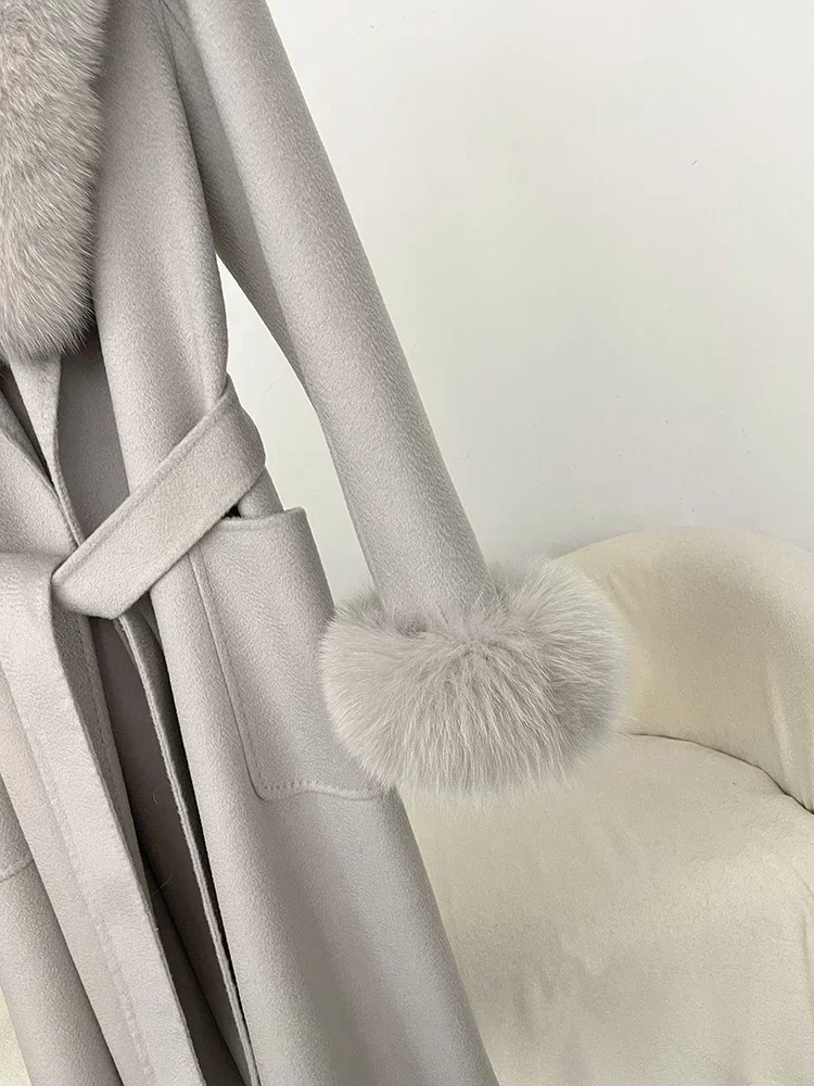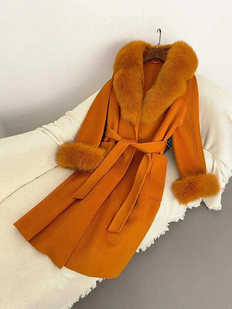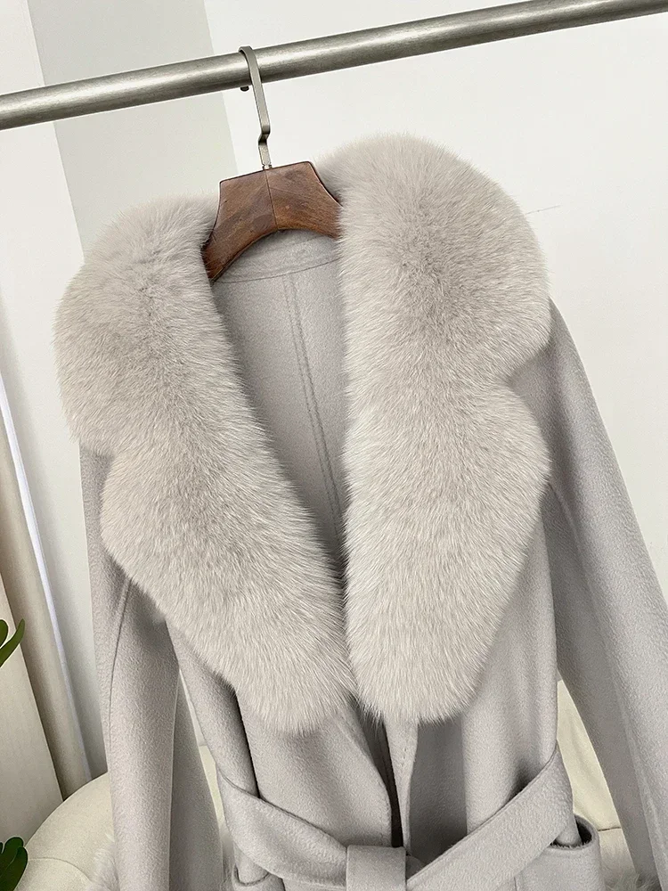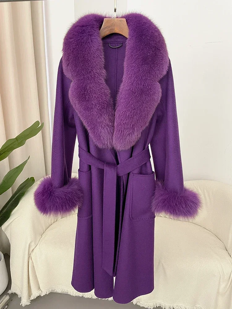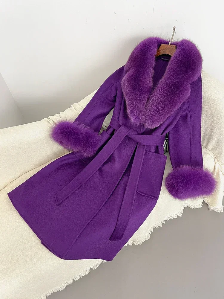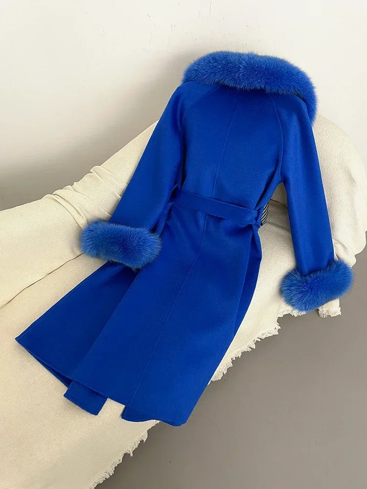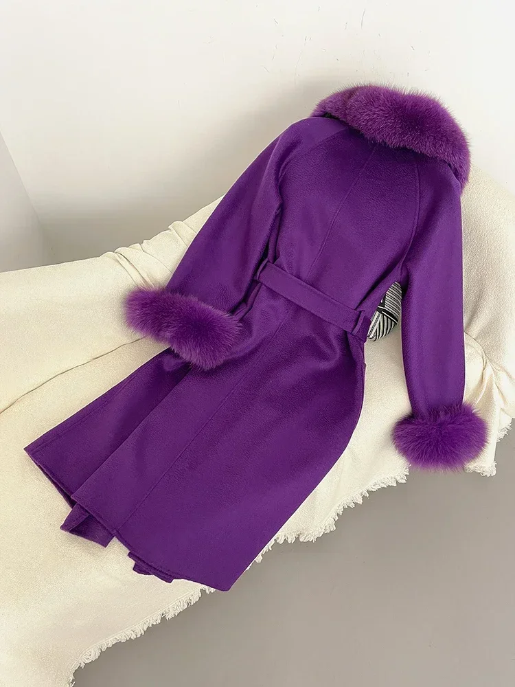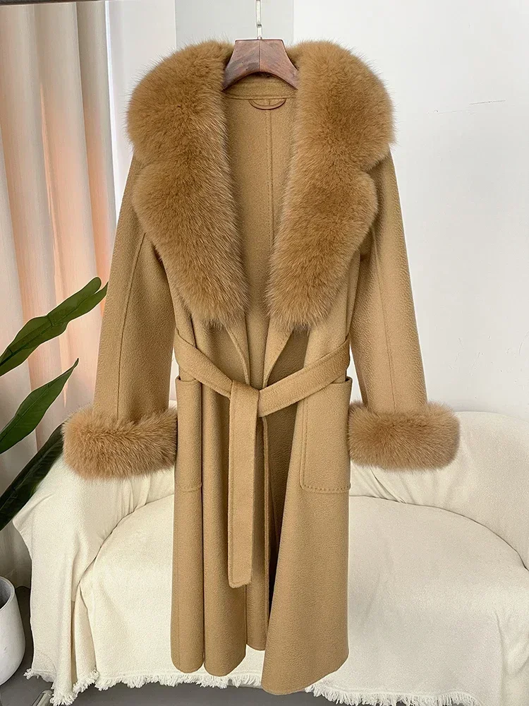 100% Wool Water-Corrugated Woolen Coat with Detachable Fox Fur Collar Women Daily Casual Wear 2024 Autumn Winter Original Design