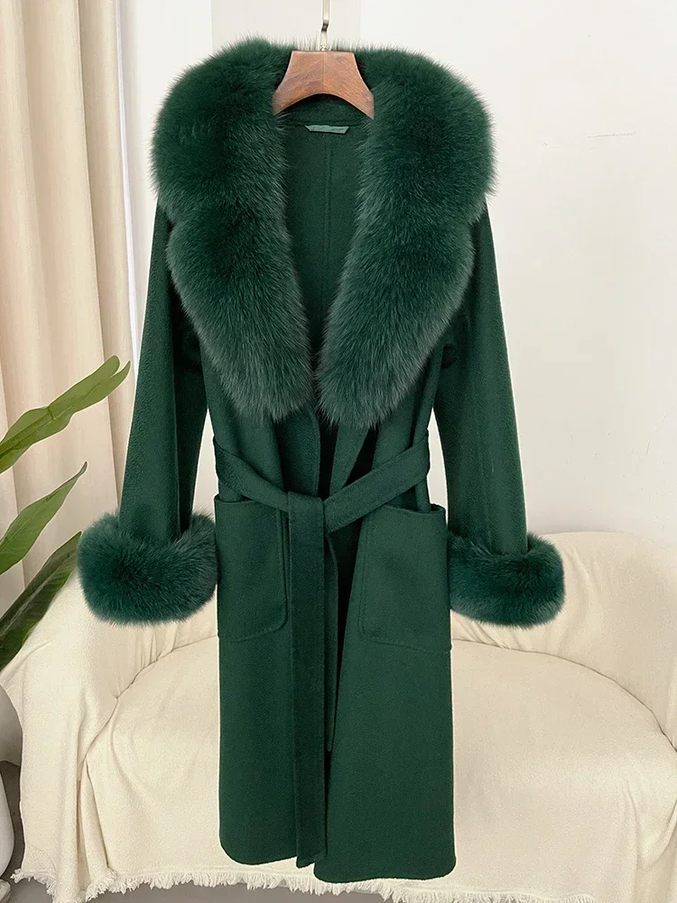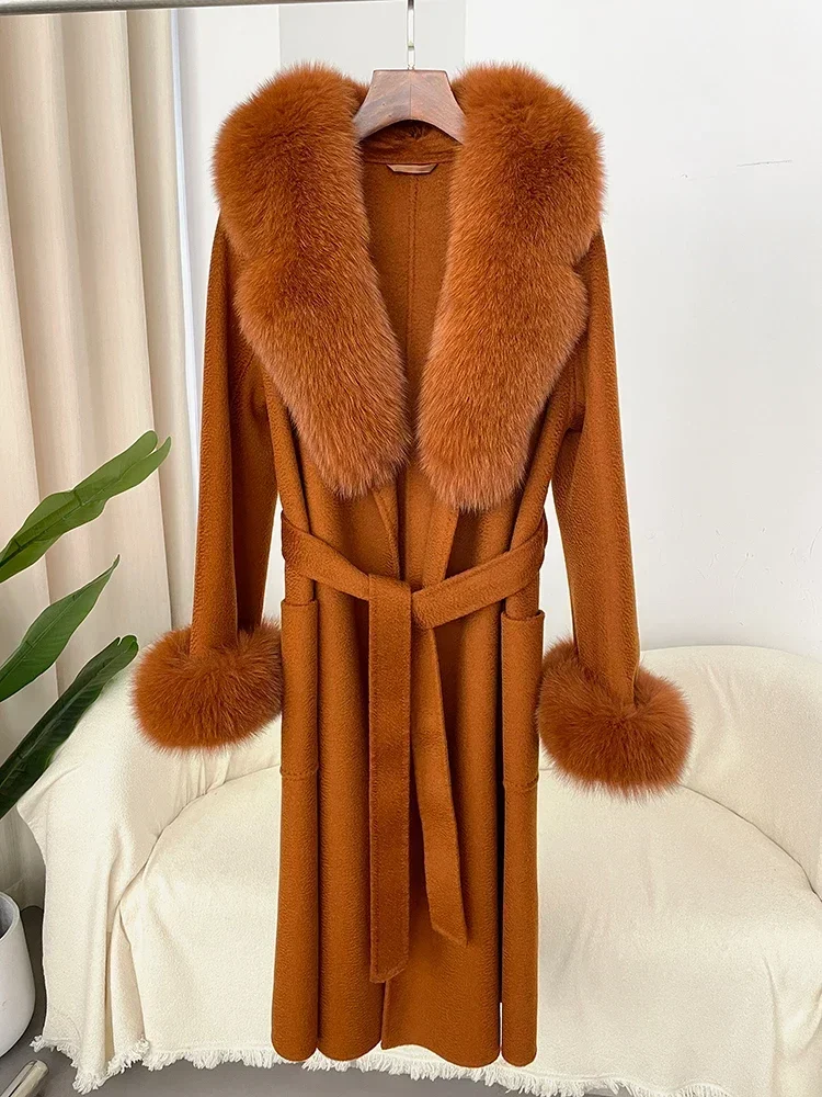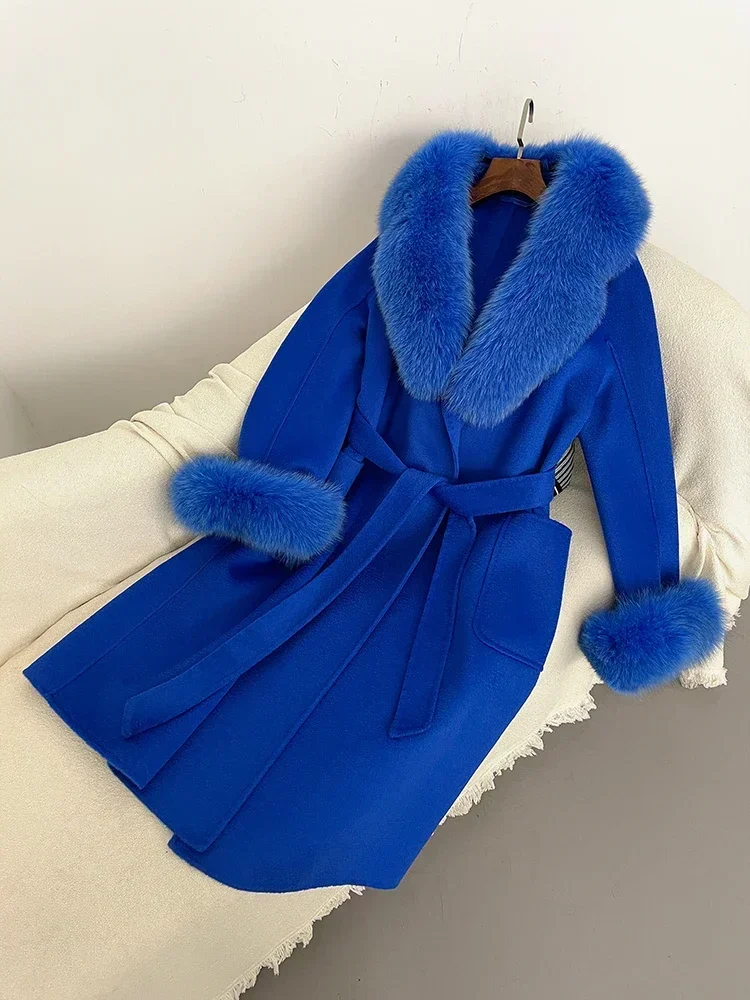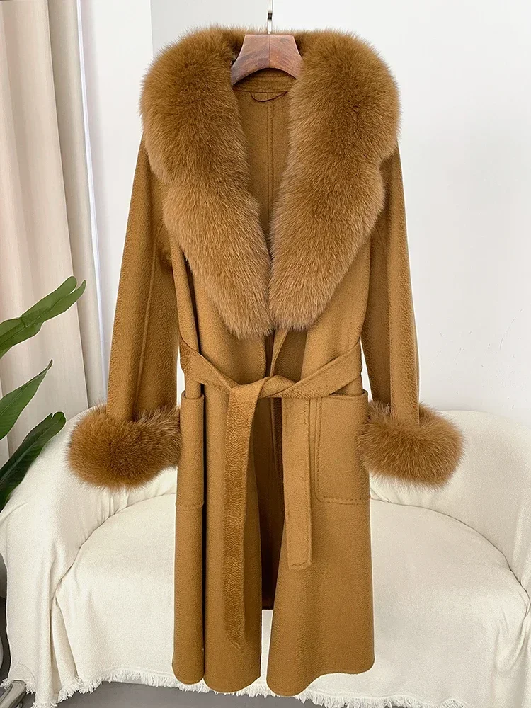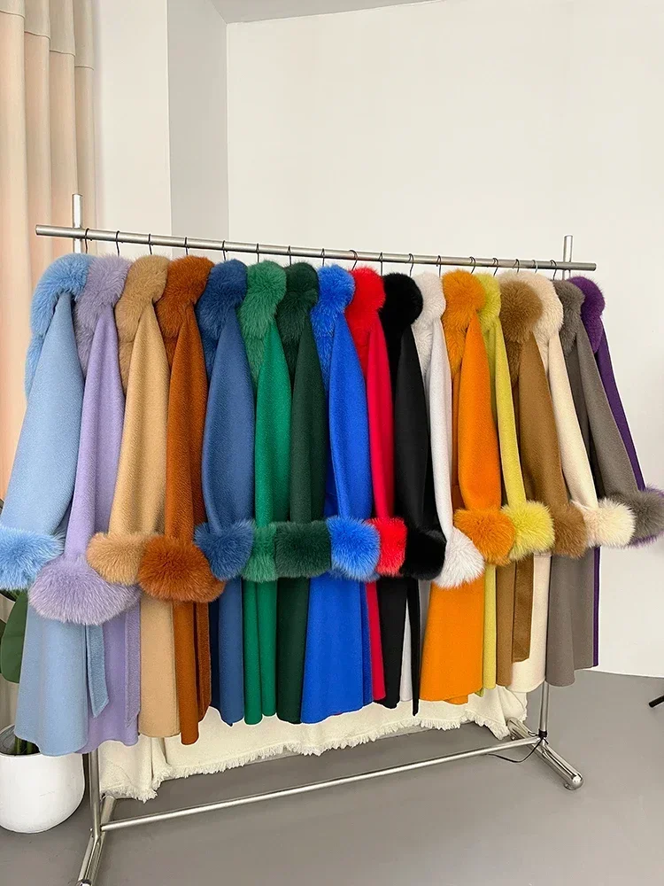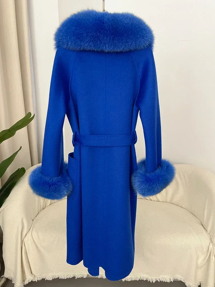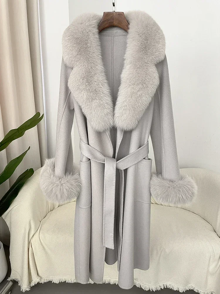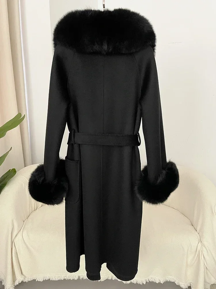 100% Wool Water-Corrugated Woolen Coat with Detachable Fox Fur Collar Women Daily Casual Wear 2024 Autumn Winter Original Design