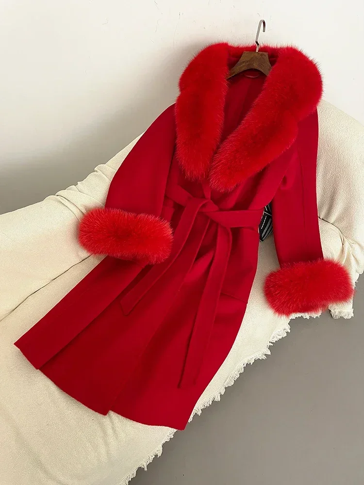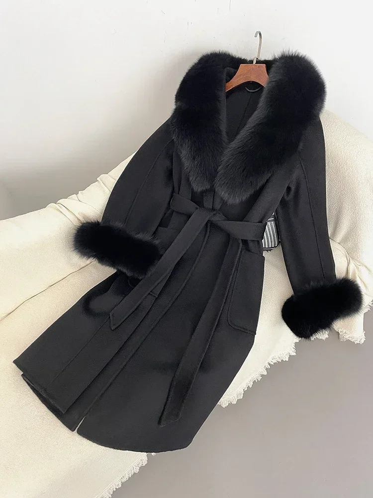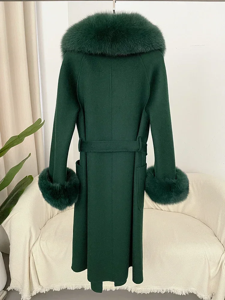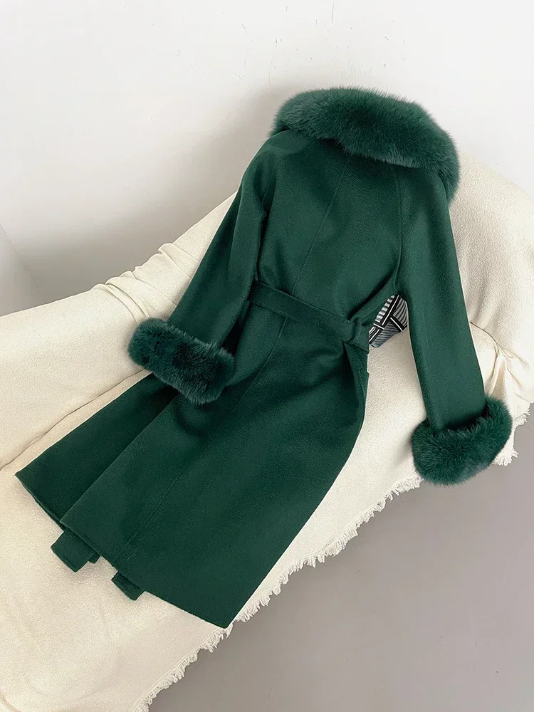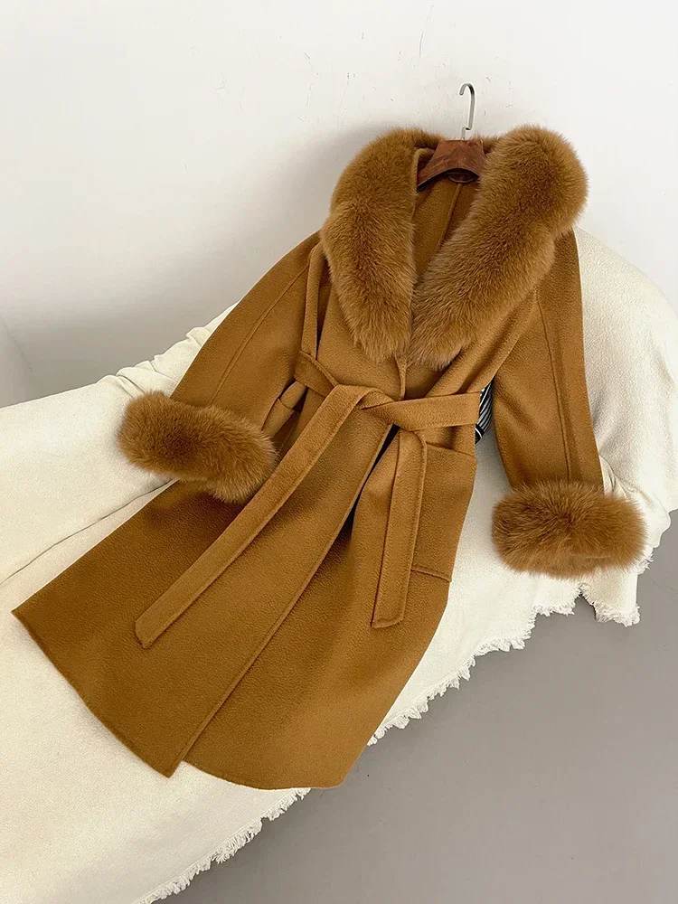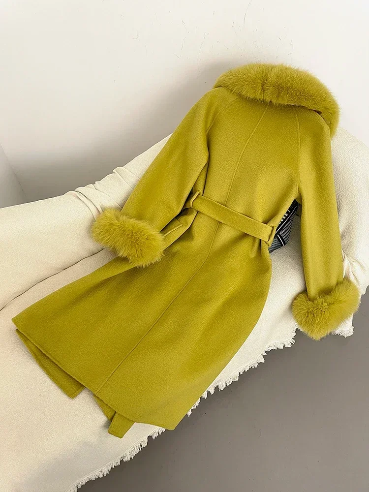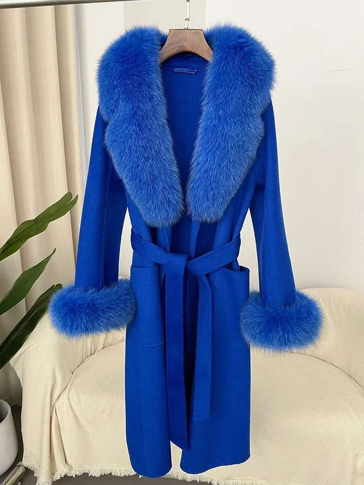 100% Wool Water-Corrugated Woolen Coat with Detachable Fox Fur Collar Women Daily Casual Wear 2024 Autumn Winter Original Design