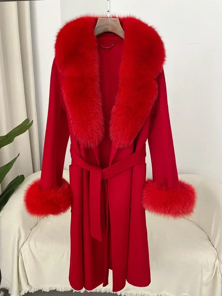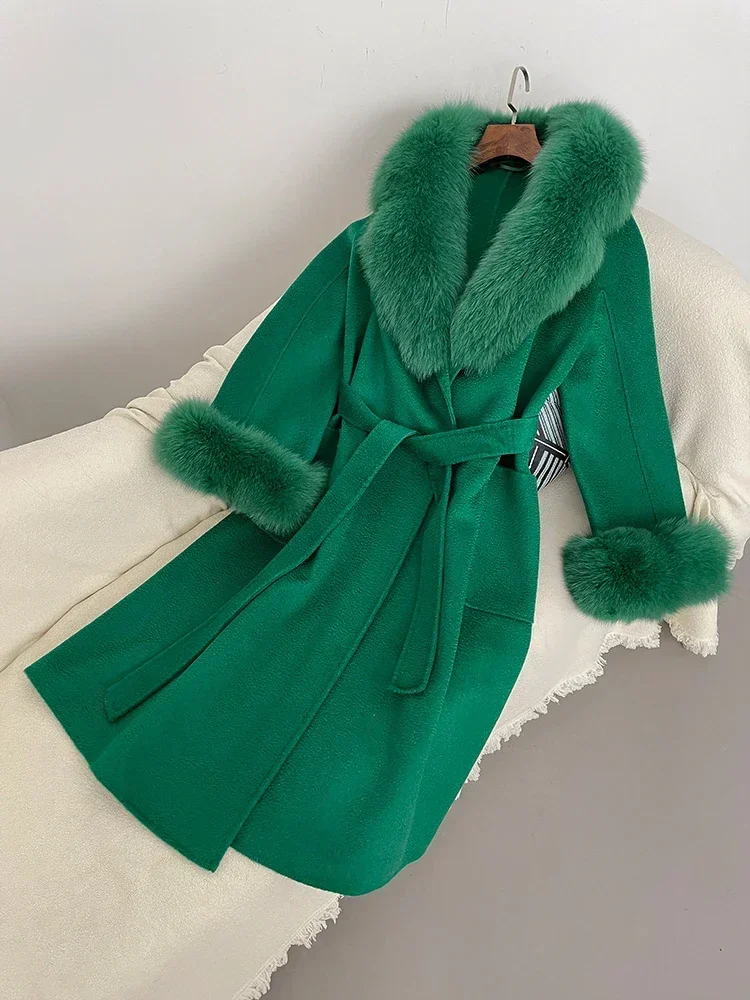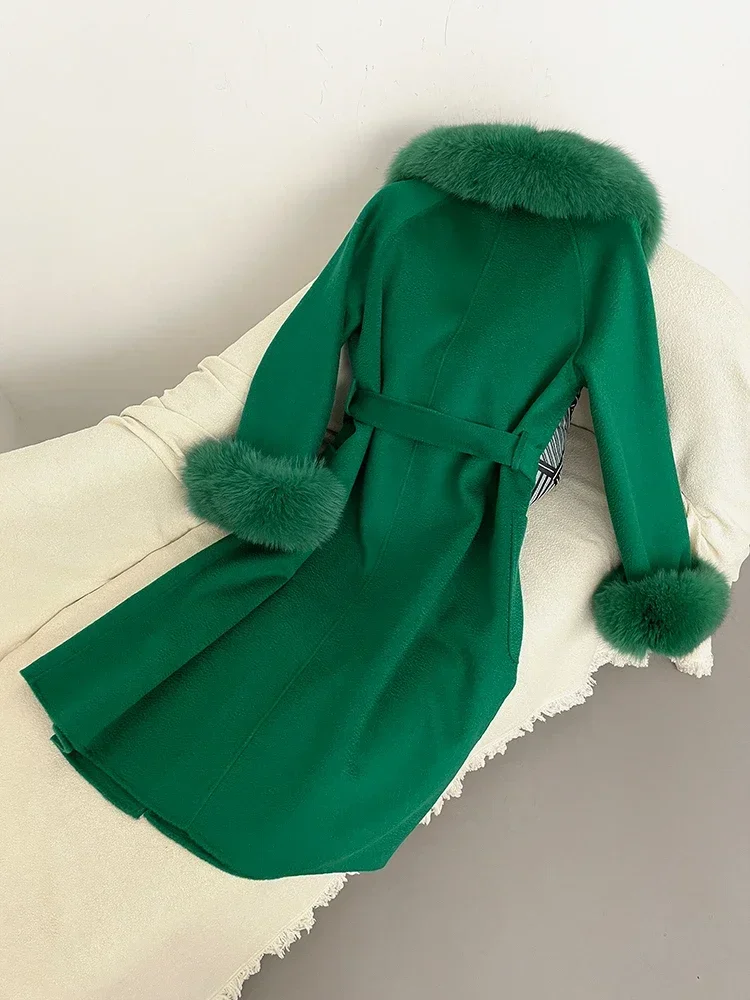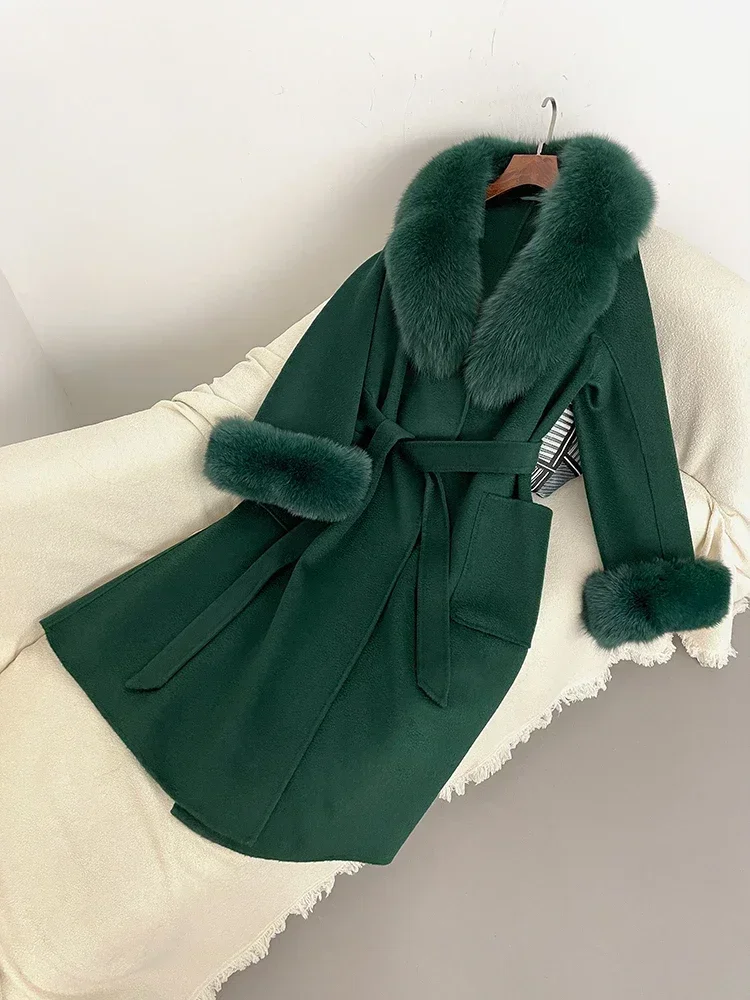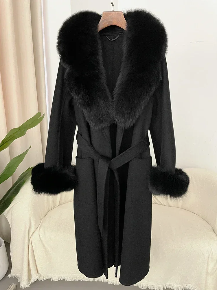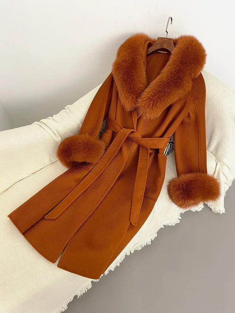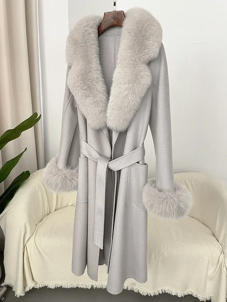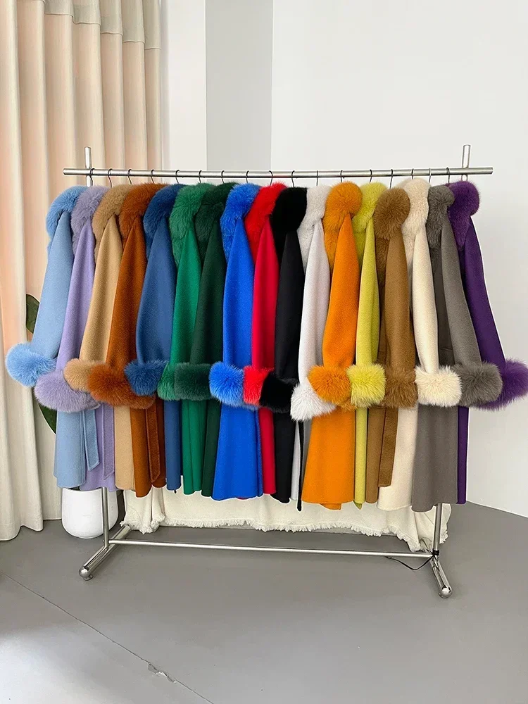 100% Wool Water-Corrugated Woolen Coat with Detachable Fox Fur Collar Women Daily Casual Wear 2024 Autumn Winter Original Design