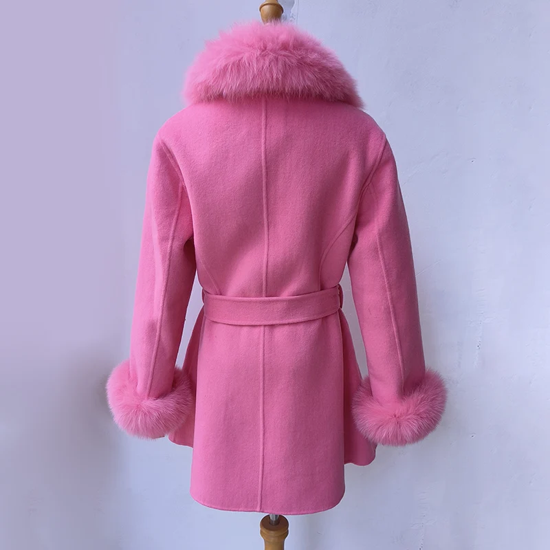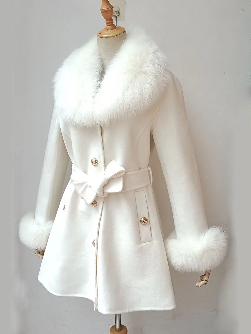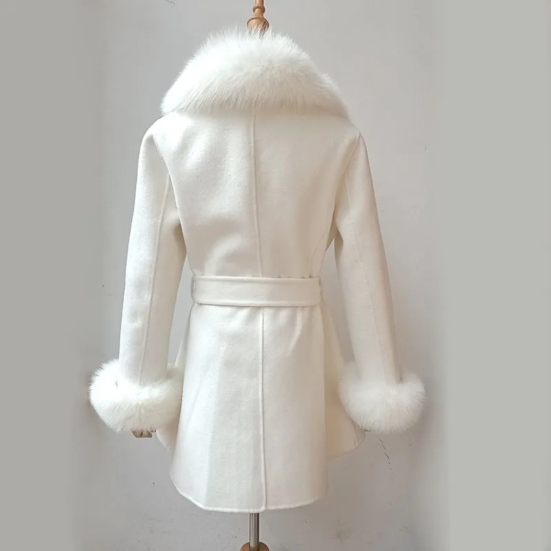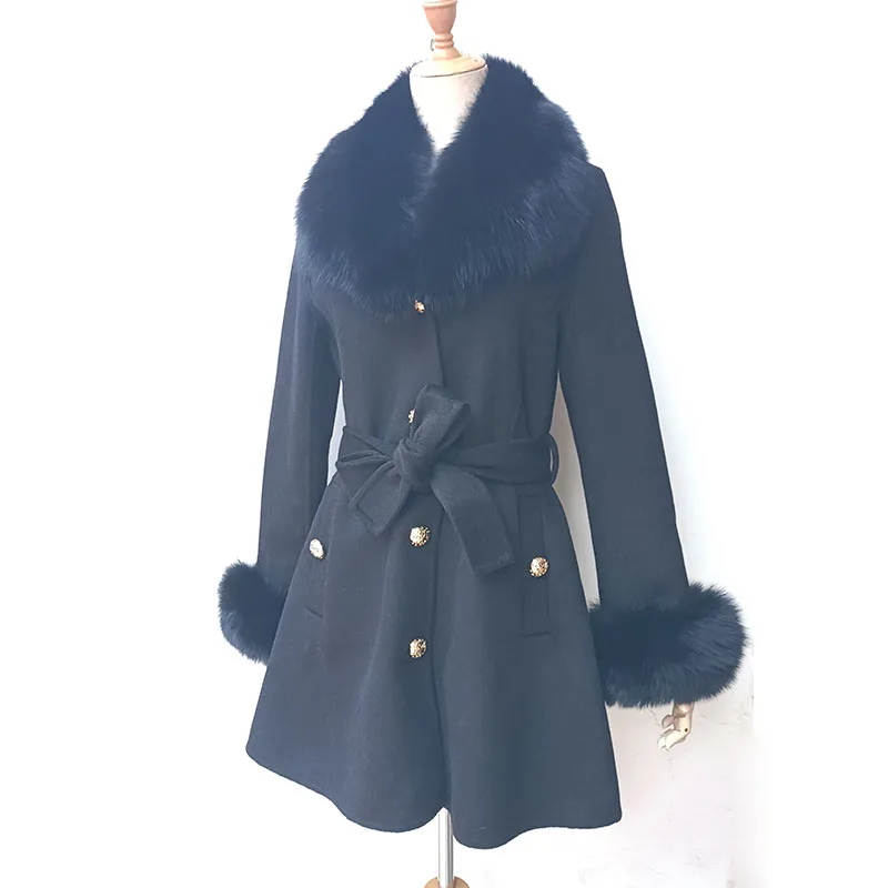 Women's Genuine Wool Blended Coat With Real Fox Fur Collar and Cuff