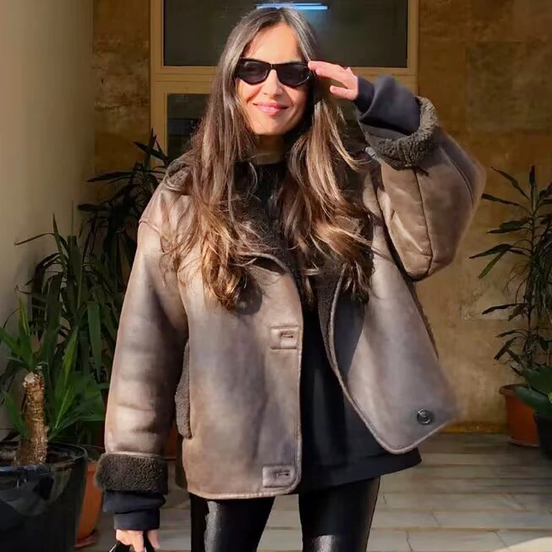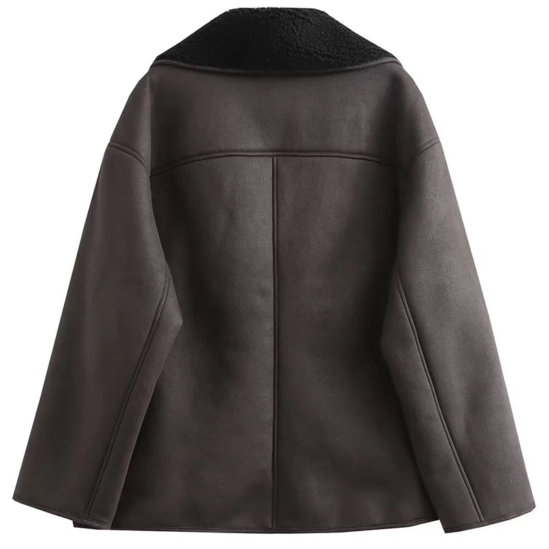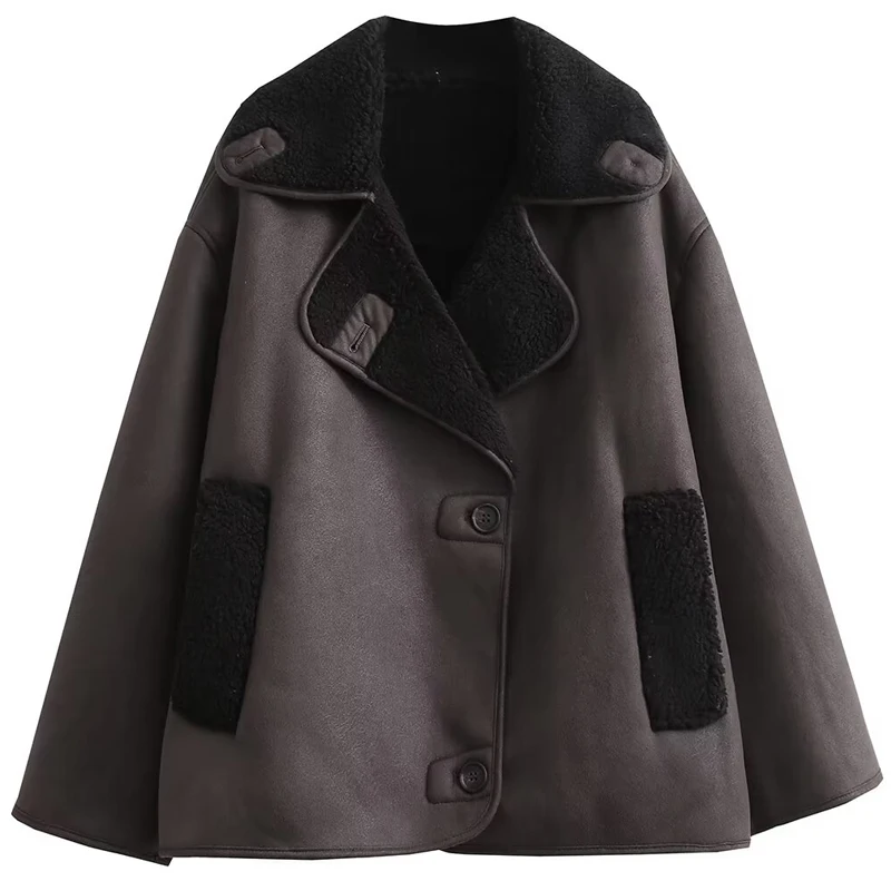 HXAO Women's Jackets Winter Coat Female Leather Faux Fur Coat Button Crop Outerwears Windbreak Waterproof Brown Long Sleeve Tops